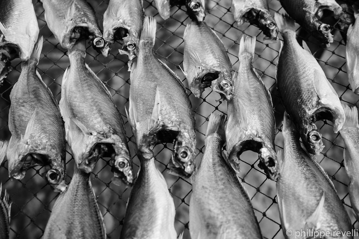 Village de Kao Seng, tout au bout de la plage. Une communauté de pêcheurs artisanaux. Du poisson sèche sur des claies. Des embarcations sont tirées sur le sable ou amarrées dans l’estuaire d’un petit cours d’eau. Des hommes bricolent un moteur. Le soleil est déjà haut. Des bouées, des cordages, des nasses, des filets. Un auvent. Des femmes, un hommes, des enfants ramendent des filets. Un autre auvent. Des hommes bavardent.