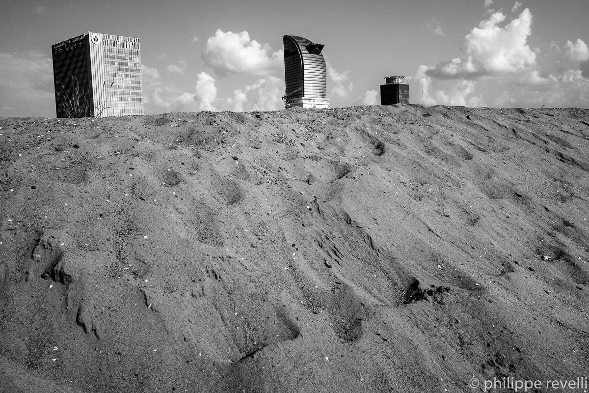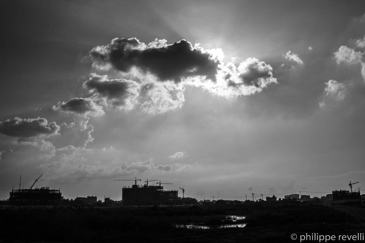 Une route droite, bitumée, sans ombre, bordée d’un côté par un monticule de sable, de l’autre par une palissade de tôle délimitant un vaste espace sableux, plat, vide. Ici ou là, quelques mares affleurent encore, vestiges aqueux de ce qui fût le lac Boeung Kak.
