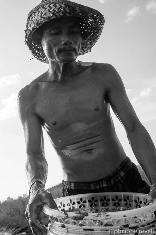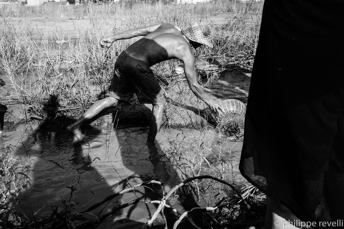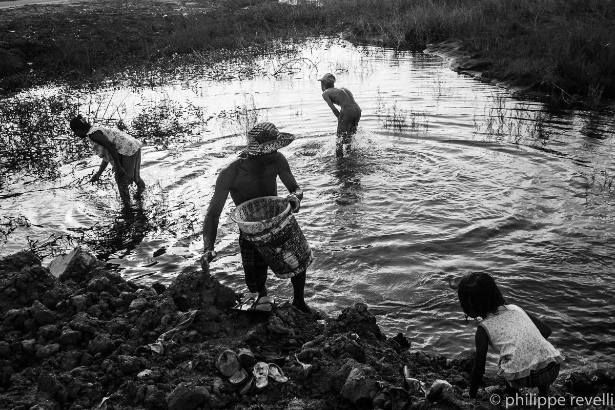 Cet après-midi, une famille de ces irréductibles habitants de Boeung Kak pêche dans une mare, juste au bord de la route. Ni hameçon ni de filet, juste une écumoire en plastique et un seau, plongés au petit bonheur dans cinquante centimètres d’eau boueuse et qui ramènent, parfois, un ou deux minuscules poissons-chat : à faire frire ou sécher.