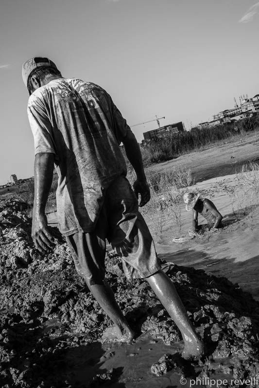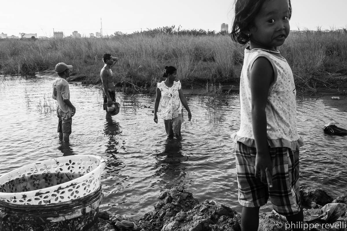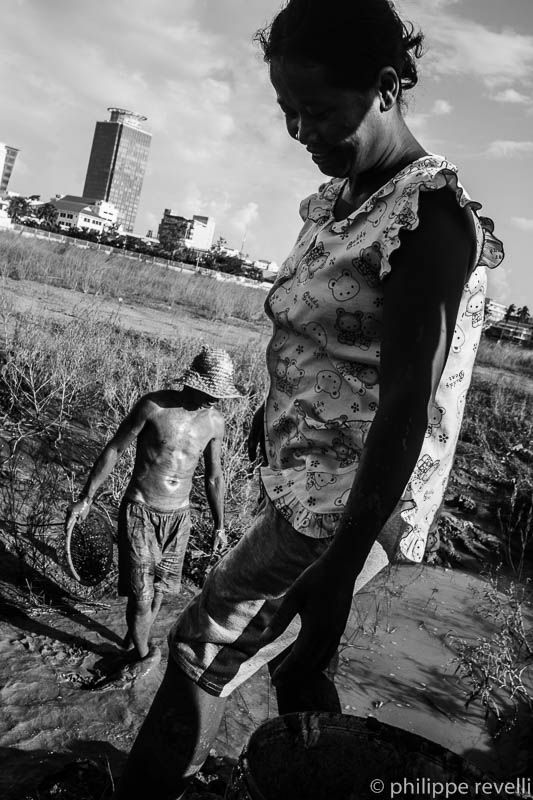 Parti photographier du sable – celui qui a servi a combler le lac Boeung Kak – je suis tombé sur une famille pêchant de minuscules poissons-chat dans une mare boueuse.