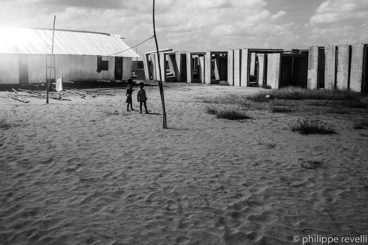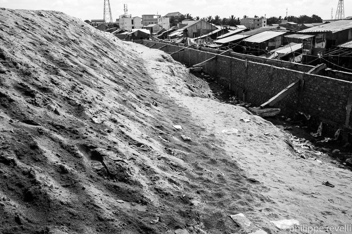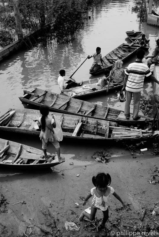 Image 2. Sur un chemin de terre surélevé qui avance loin à l’intérieur du lac, bordé par deux rangs de maisons sur pilotis auxquelles on accède par des passerelles de planches plus ou moins branlantes, un colporteur pousse sa charrette. Il vend de minuscules palourdes ou bigorneaux d’eau douce, je ne sais plus, assaisonnées de piment et de sel. Ça sent la vase. Un peu avant midi, il ira se poster à la sortie d’une usine de confection.