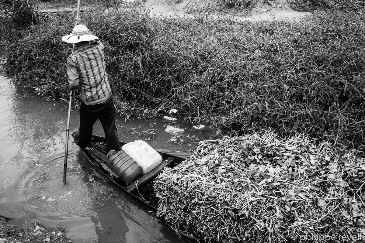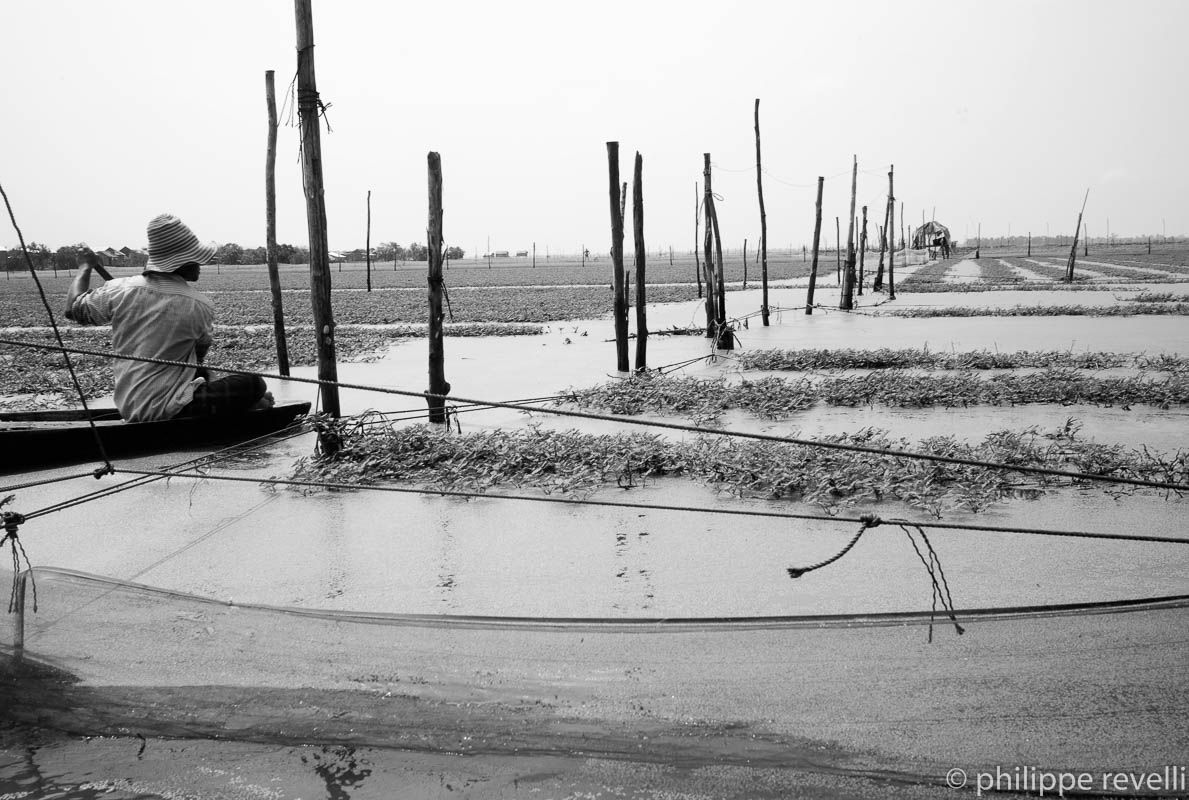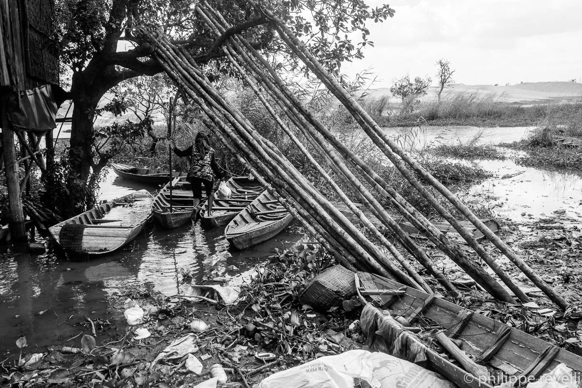 Image 1. Campé sur ses deux jambes à l’avant d’une barque de bois noirci qui disparaît presque sous un amoncellement de liserons d’eau fraîchement cueillis, l’homme, plus tout jeune, corps sec et nerveux, la moitié de son visage dissimulée dans l’ombre noire de son chapeau, pèse sur sa perche de bambou, manœuvrant lentement entre les pilotis des maisons, les arbres immergés jusqu’à mi-tronc, les bancs de sable et les pieux enfoncés dans la vase et tendus de filets qui délimitent les jardins lacustres du lac Tampoun.