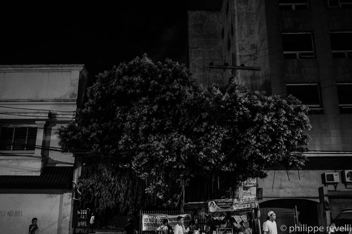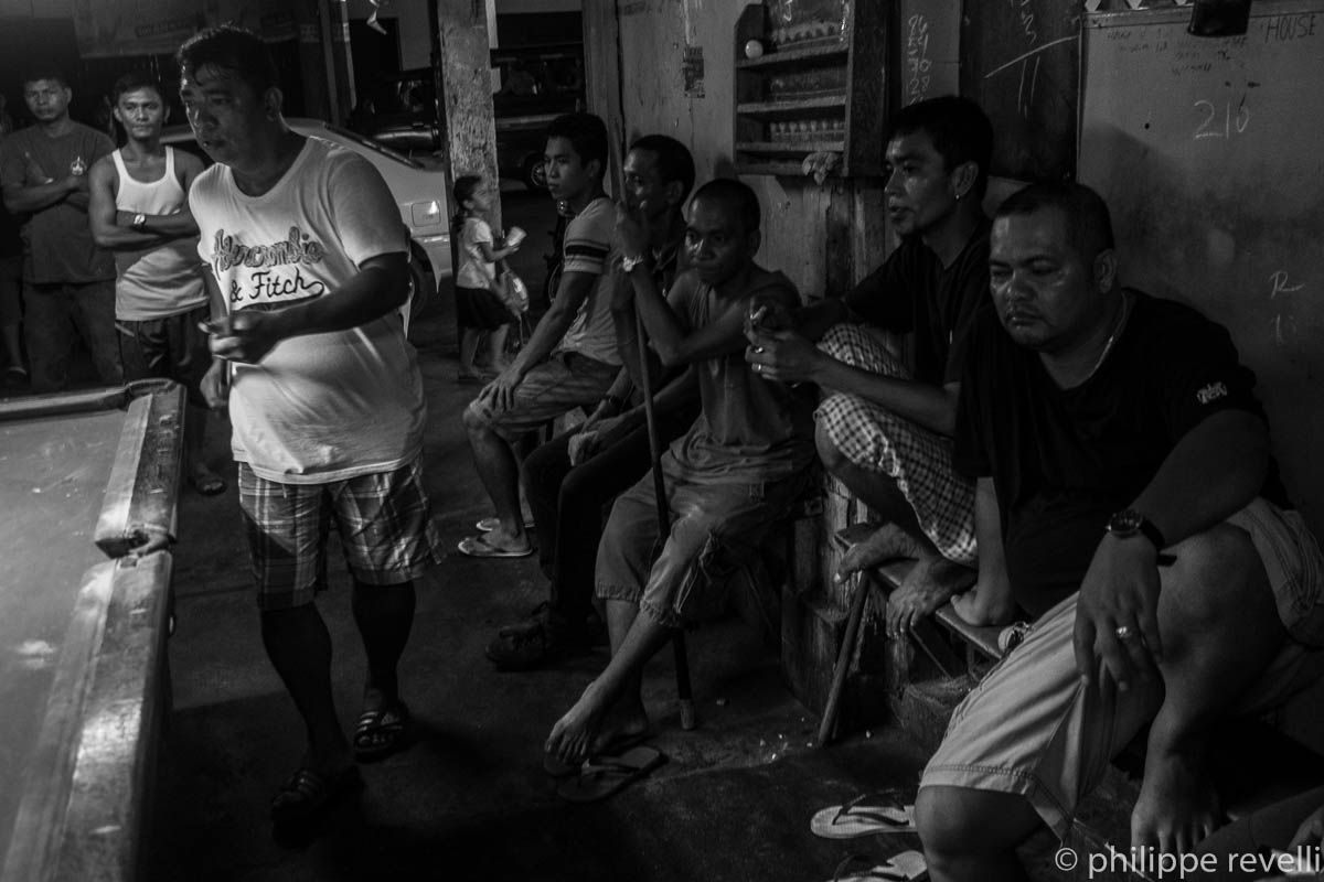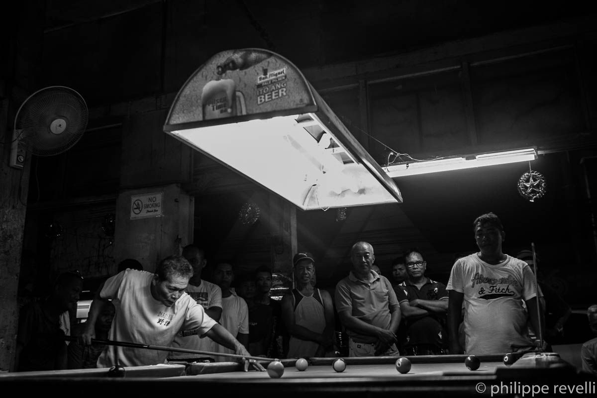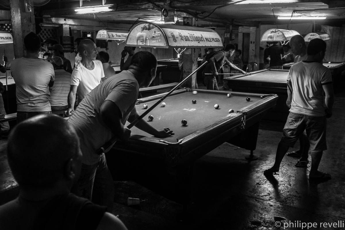 Davao, 1,2 millions d’habitants, troisième agglomération des Philippines (après Métro Manille et Cebu). Mon camp de base pour ce reportage. La région de Compostela Valley, au nord de Davao, étant conflictuelle – forte présence de la NPA (Nouvelle armée du peuple, guérilla d’obédience communiste), militaires et paramilitaires, milices des compagnies minières… -, une visite sur place se prépare. Organisations paysannes, indigènes, de défense des droits humains, écologistes : je frappe à plusieurs portes. Entre deux rencontres, j’arpente la ville. De jour, de nuit. Ça donne des images qui n’ont rien à voir avec mon sujet – que vient foutre un club de billard dans cette histoire ? Et je prends des cafés, des notes, le temps de lire la presse – les trois vont bien ensemble.