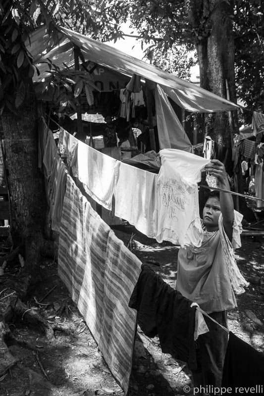 Iyay. « J’ai 31 ans. J’ai trois enfants. J’habite sitio Monkay, barangay Sagupitan, commune de Kapalong. Mon mari est un responsable du KMP (organisation paysanne), il a quitté le village en juillet dernier – il n’était pas en sécurité – et travaille à Davao. Les militaires m’ont interrogé à plusieurs reprises en demandant où se cachait mon mari. Ils sont particulièrement suspicieux avec les femmes seules. Ils pensent que notre mari est dans la montagne, avec la guérilla, Le mois dernier, j’ai quitté le village de nuit pour rejoindre mon mari, à Davao. Et y’a dix jours nous sommes venus ici, à l’UCCP Haran ».