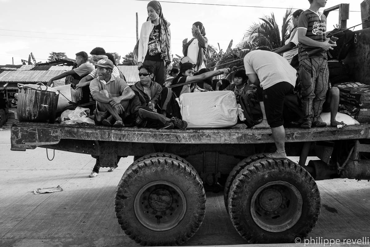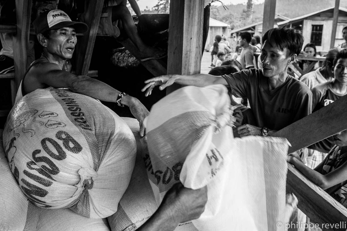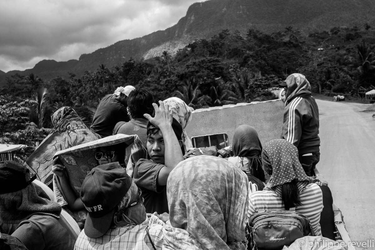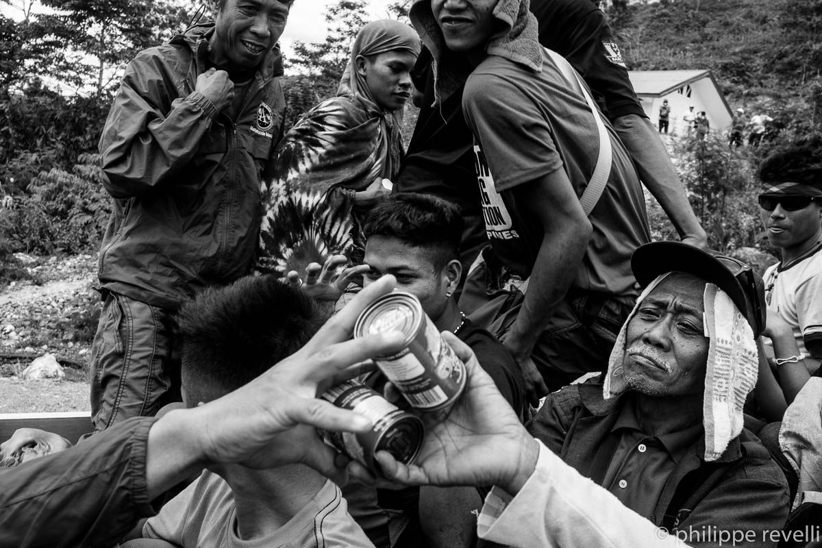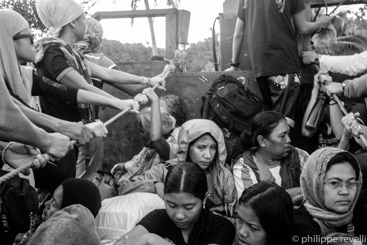 Samedi 30 juin. Campus de l’UCCP Haran. Des sacs de riz, d’abord, puis une trentaine de personnes s’entassent dans la benne du camion affrété par Exodus for Justice and Peace (EJP). EJP se définit comme un groupe impulsé par l’église, qui cherche à promouvoir la paix en s’attaquant aux causes profondes du conflit armé à Mindanao, agit en faveur de la justice et pour la défense des droits humains. Les sacs de riz sont destinés aux habitants du sitio Kasunugan – 37 familles d’indigènes Mandaya (l’un des 17 groupes ethnolinguistiques regroupés sous le terme générique de Lumads – indigènes de Mindanao). Les passagers sont pour une bonne part membres d’organisations de la gauche radicale, parmi lesquels des auxiliaires de santé, un médecin, des militants de Karapatan (défense des droits humains). De jeunes indigènes de Talaingod, Kapalong et Butuan, réfugiés à Haran, sont du voyage. Le Pasteur Edgar fait office de coordinateur.