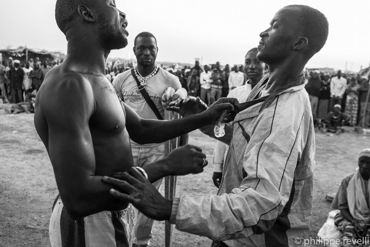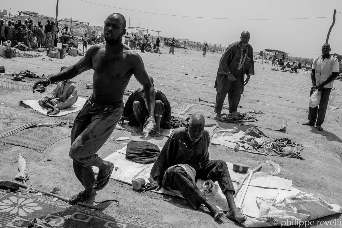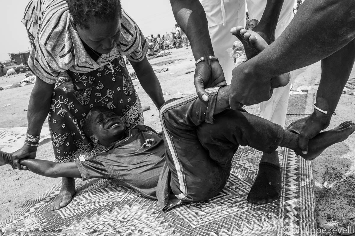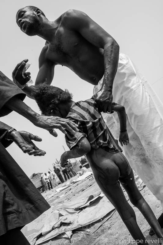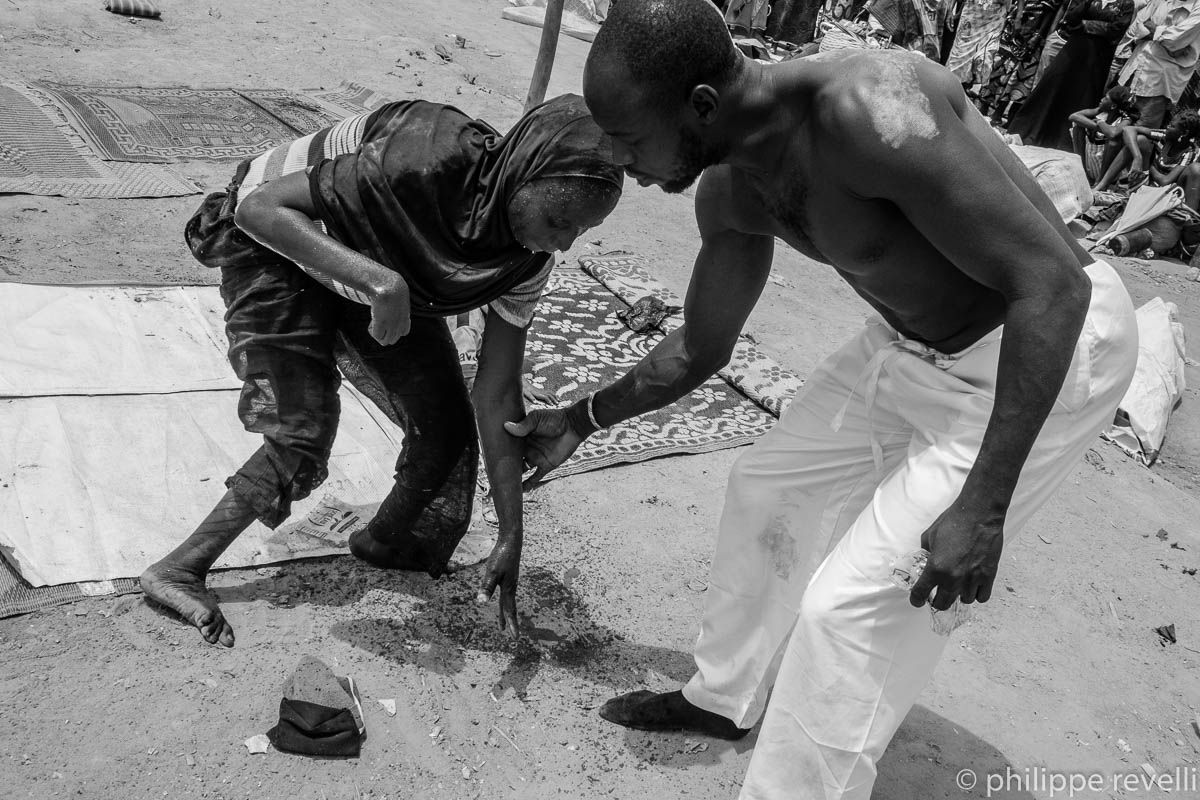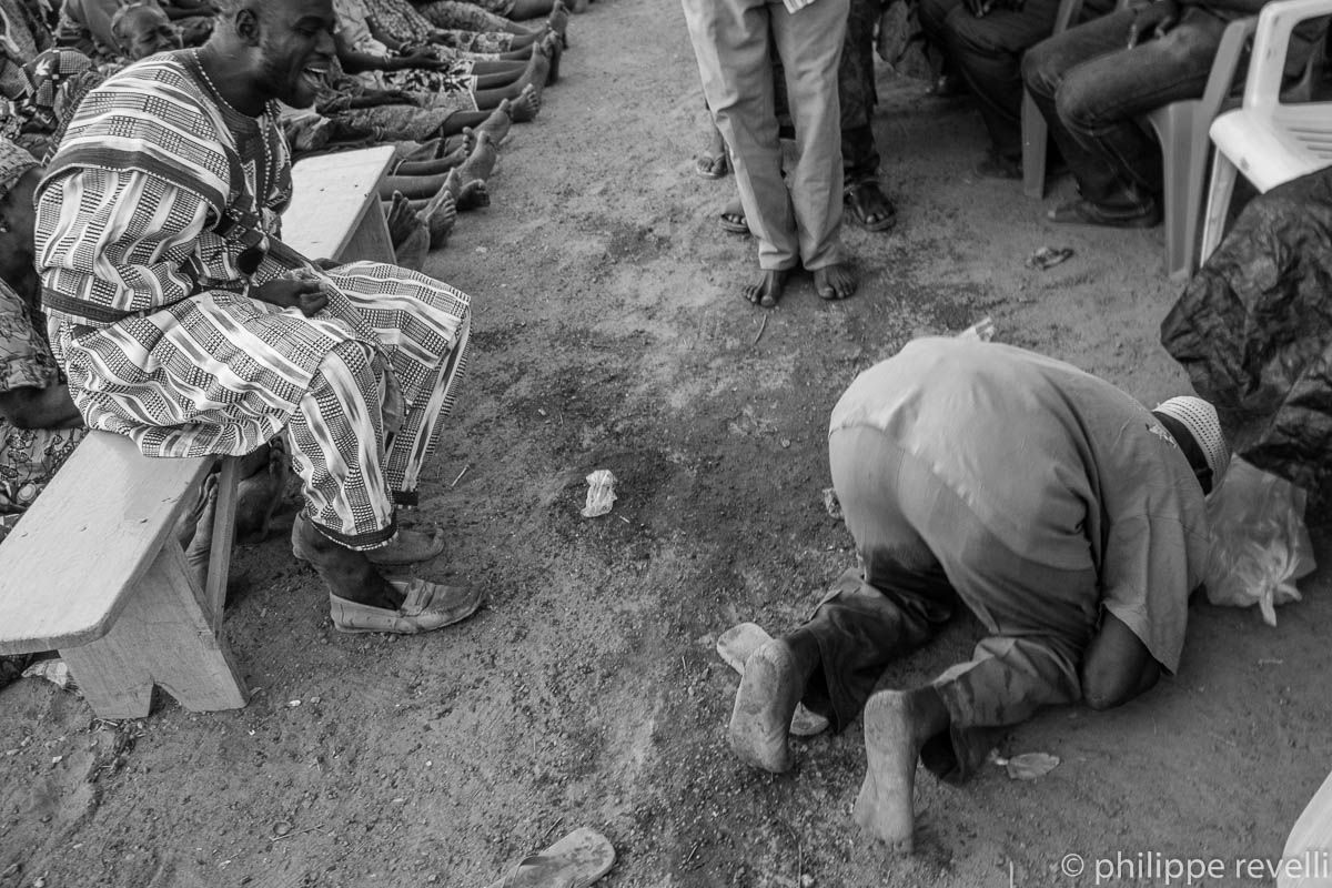 Il arrose collectivement les malades avec de l’eau minérale en sachet, invoque la guérison divine, papillonne d’un patient ou d’un groupe à l’autre selon une logique connue de lui seul, asperge encore et toujours d’eau minérale, questionne sans beaucoup s’attarder sur les zones douloureuses, tape du plat de la main sur les dos, les jambes, les épaules, malaxe les membres atrophiés de la plante du pied et des orteils, remet une dose d’eau minérale, encourage, rudoie, plaisante, se met en colère quand il estime qu’on lui fait perdre son temps… Boulango Dabourgou admet ne pas avoir de méthode, improviser en suivant son inspiration et ne pas être en mesure d’expliquer pourquoi ça marche.