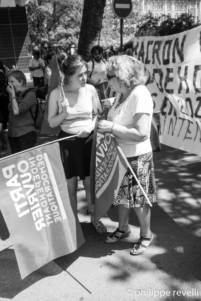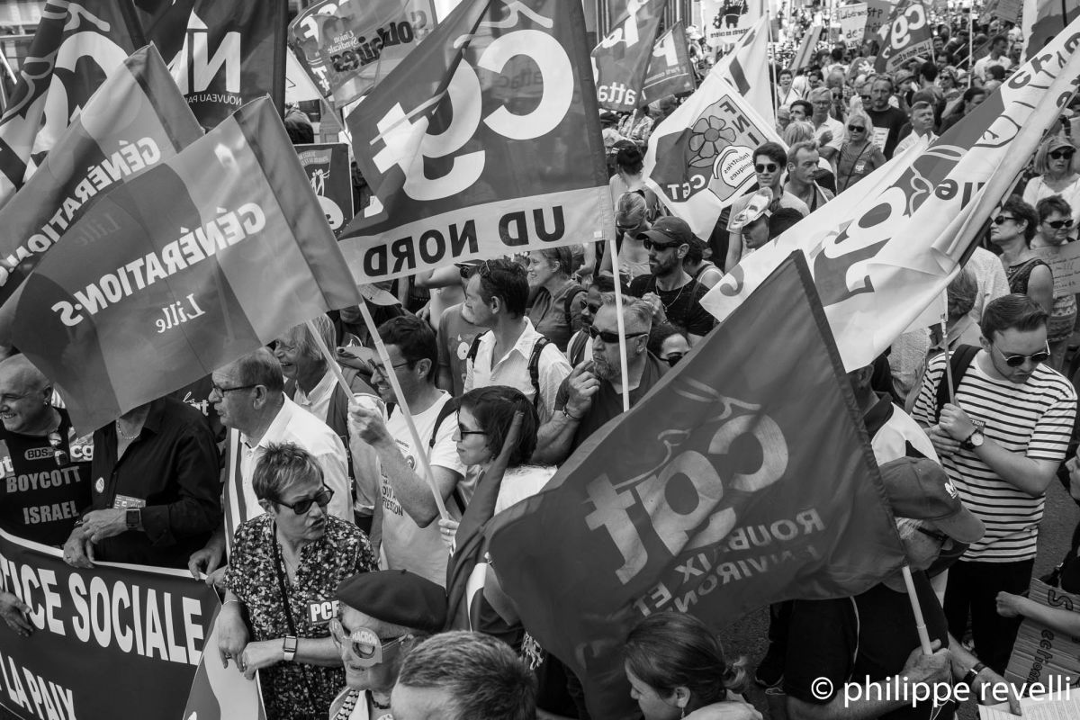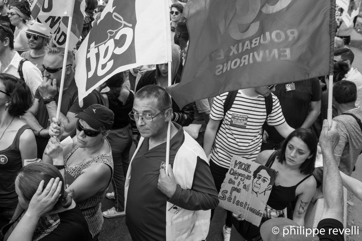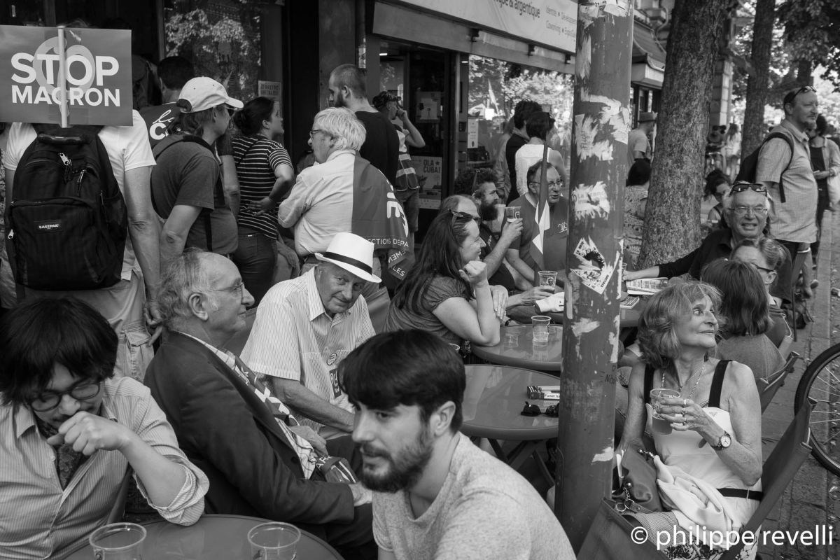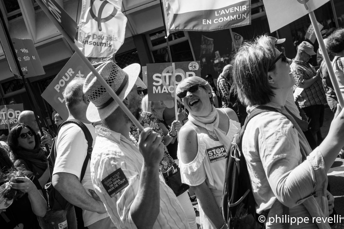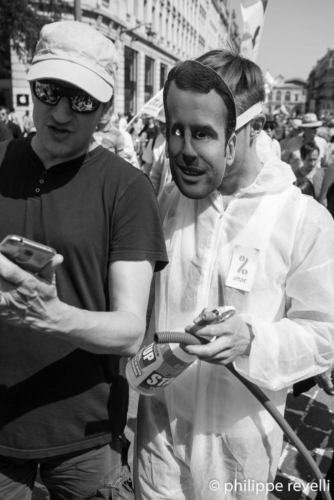 Y’en a qui déroulent des banderoles, y’en a qui répartissent des pancartes, y’en a qui portent des drapeaux, y’en a qui distribuent des tracts détractant Macron, son gouvernement, les élus de la Raie Publique en marche forcée, le MEDEF et les patrons en général, y’en a qui se servent d’un mégaphone (mais toujours pour conspuer Macron, son gouvernement, les élus de la Raie Publique en marche forcée, le MEDEF et les patrons en général). Moi, je suis plutôt d’accord avec eux (les tracteurs et les mégaphonistes), mais ça ne m’empêche pas de faire des photos.