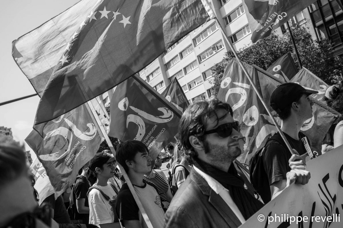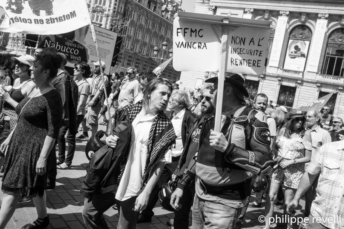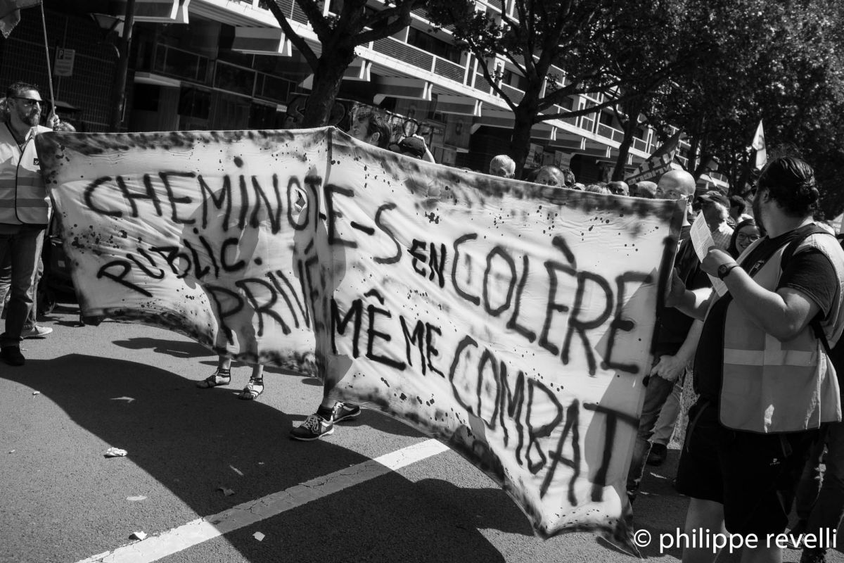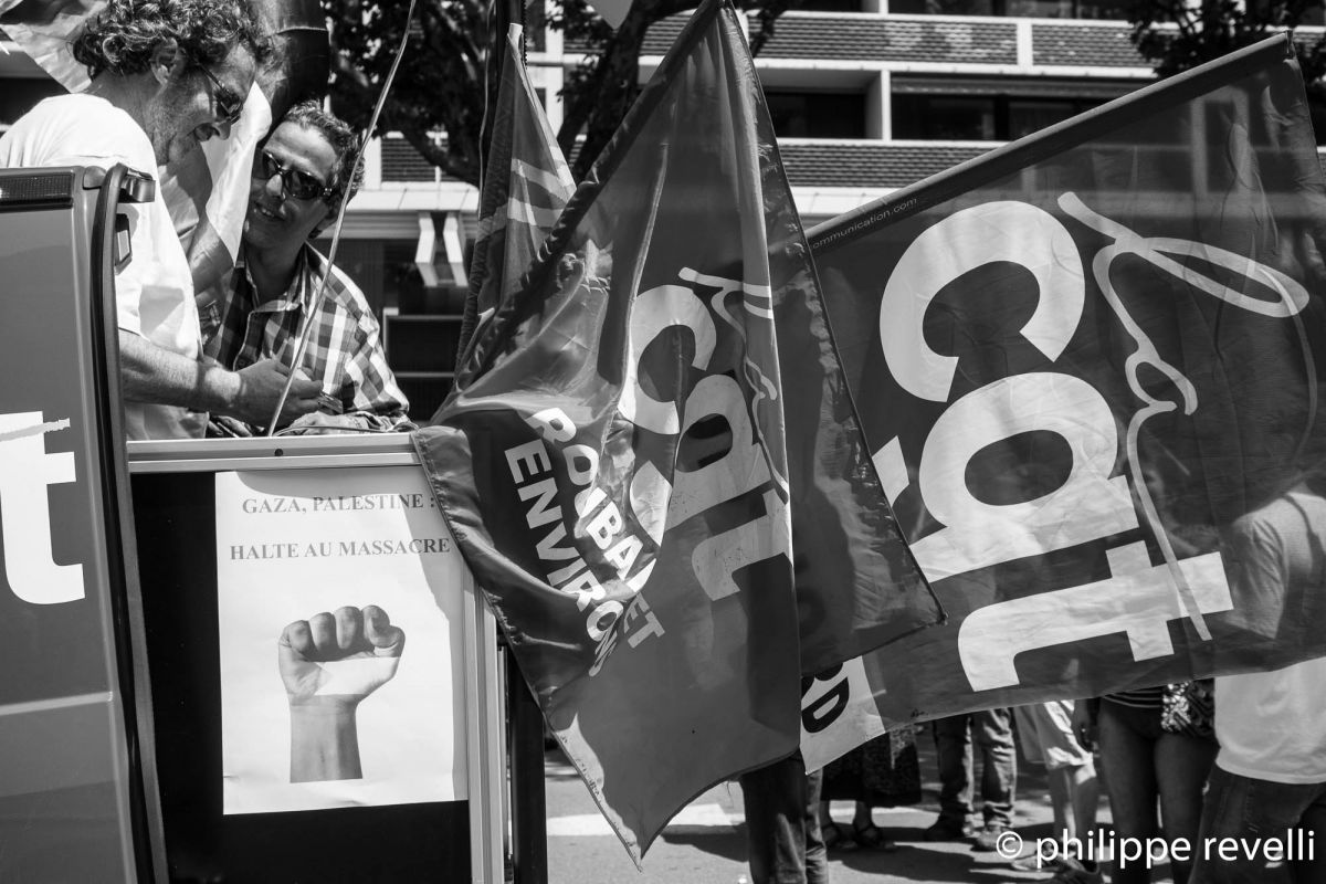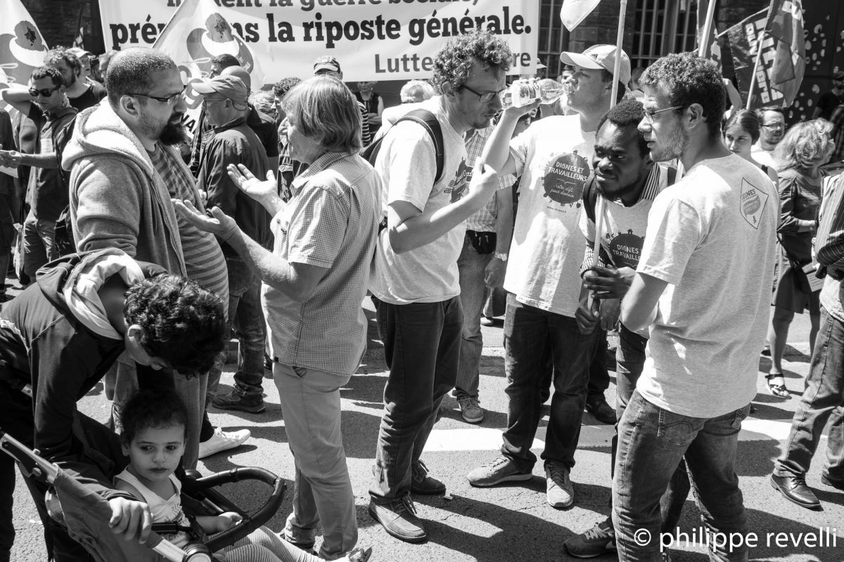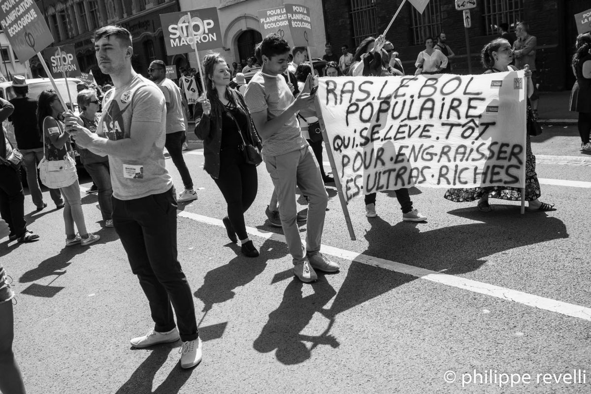 Y’en a qui déroulent des banderoles, y’en a qui répartissent des pancartes, y’en a qui portent des drapeaux, y’en a qui distribuent des tracts détractant Macron, son gouvernement, les élus de la Raie Publique en marche forcée, le MEDEF et les patrons en général, y’en a qui se servent d’un mégaphone (mais toujours pour conspuer Macron, son gouvernement, les élus de la Raie Publique en marche forcée, le MEDEF et les patrons en général). Moi, je suis plutôt d’accord avec eux (les tracteurs et les mégaphonistes), mais ça ne m’empêche pas de faire des photos.