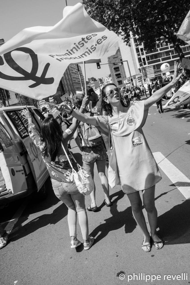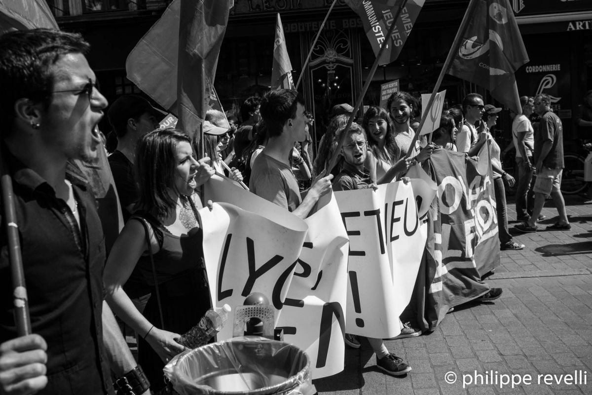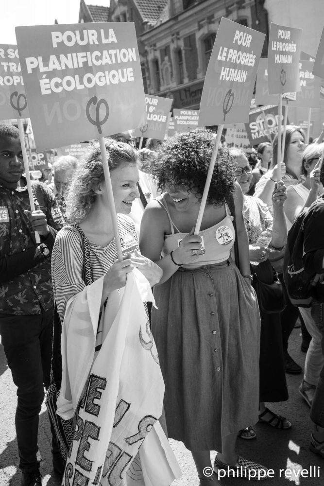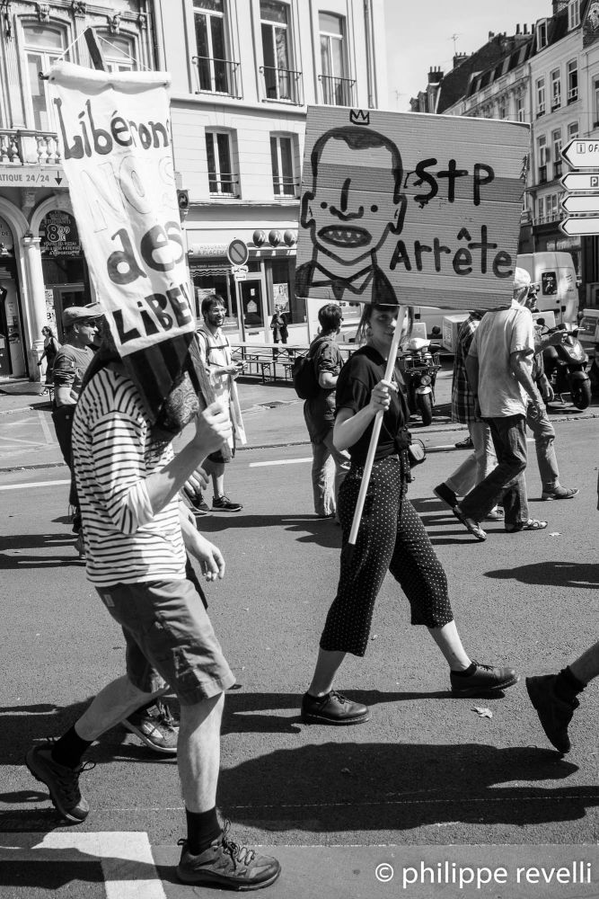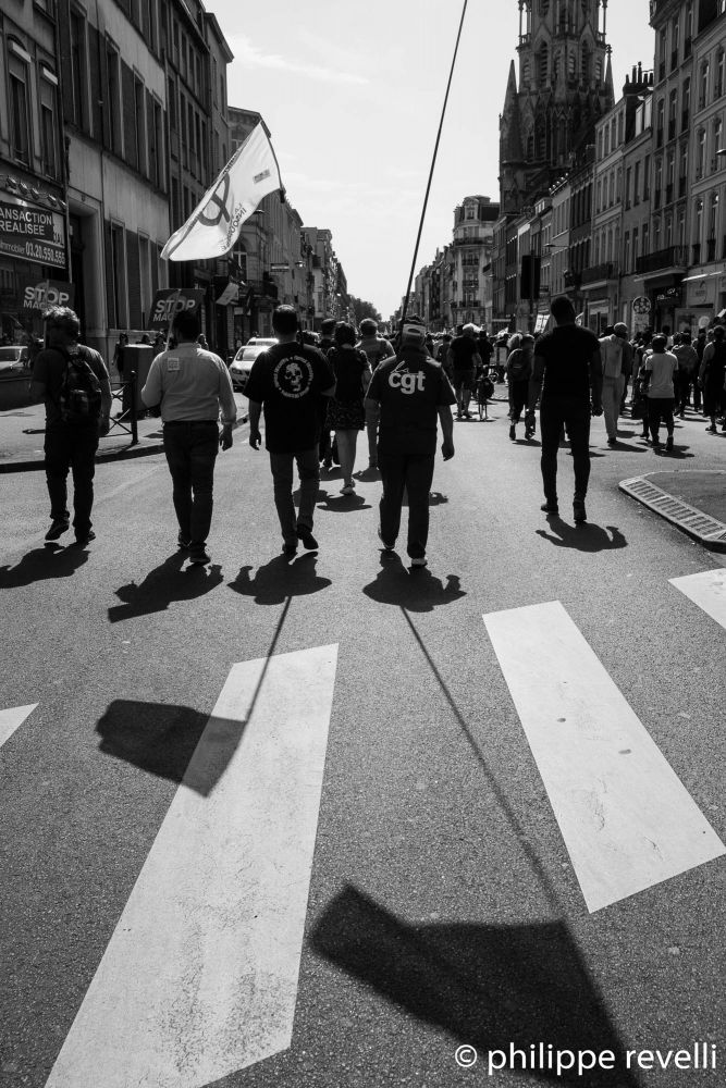 Puis le cortège s’ébranle, on se met en marche, on avance sur plusieurs rangs, on tourne d’abord à droite, puis à gauche et encore à gauche, on s’arrête parfois, on passe devant la gare, on remonte la rue Faidherbe, on traverse la Grand Place, on emprunte le boulevard de la Liberté, puis la rue Sébastopol où des âmes bien intentionnées ont rempli une benne de pavés – mais les services d’ordre ont ordre de ne pas laisser les manifestants chercher la plage cachée dessous. Moi, je fais des photos.