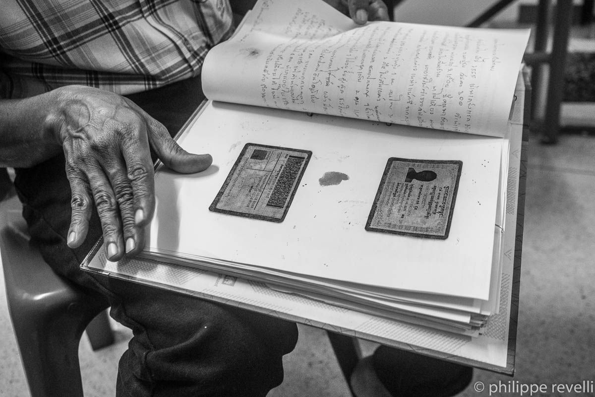 Songkhla / Suchart Chantalakanna, directeur du centre Stella Maris, montre les classeurs où il conserve l'histoire des marins-pêcheurs en situation de travail forcé qui ont été recueillis par le centre.