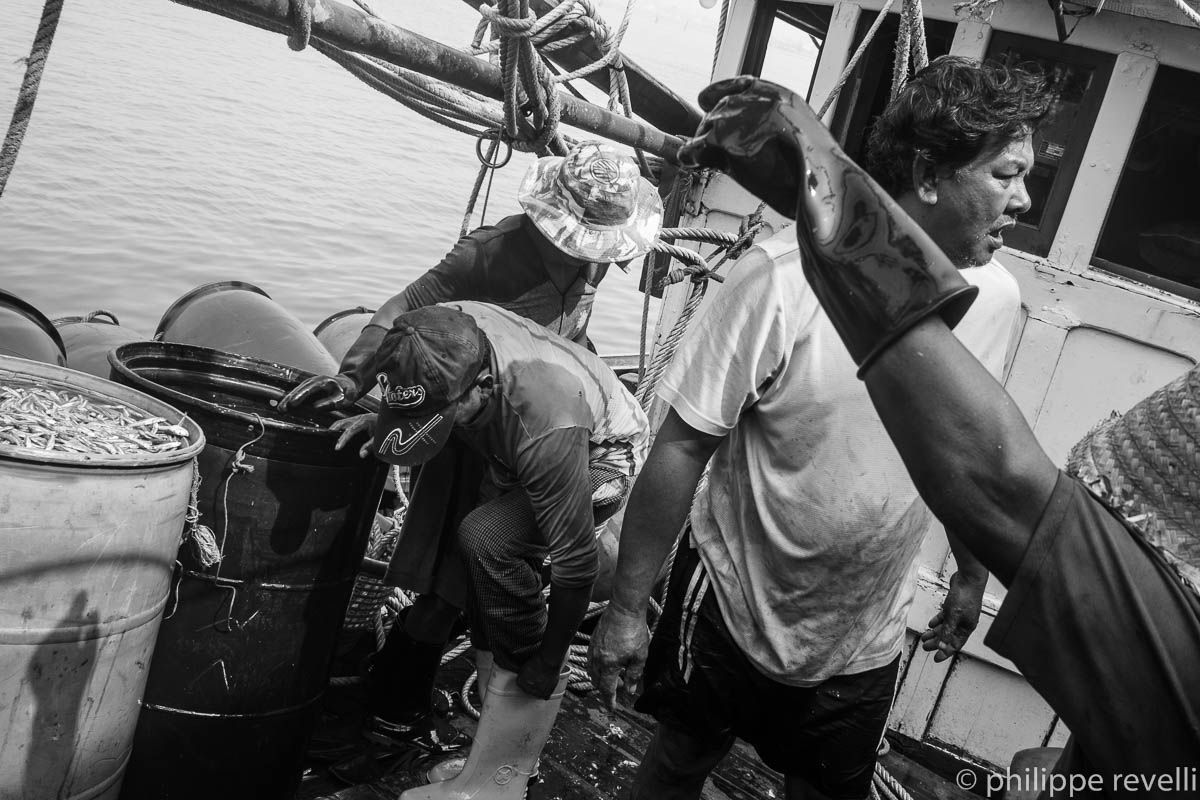 Songkhla / Port de pêche. Des bidons vides sont chargés à bord d'un bateau-mère.