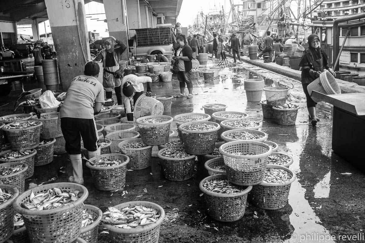 Songkhla / Port de pêche. Des femmes trient le poisson, d'autres, commerçantes, surveillent l'arrivage.