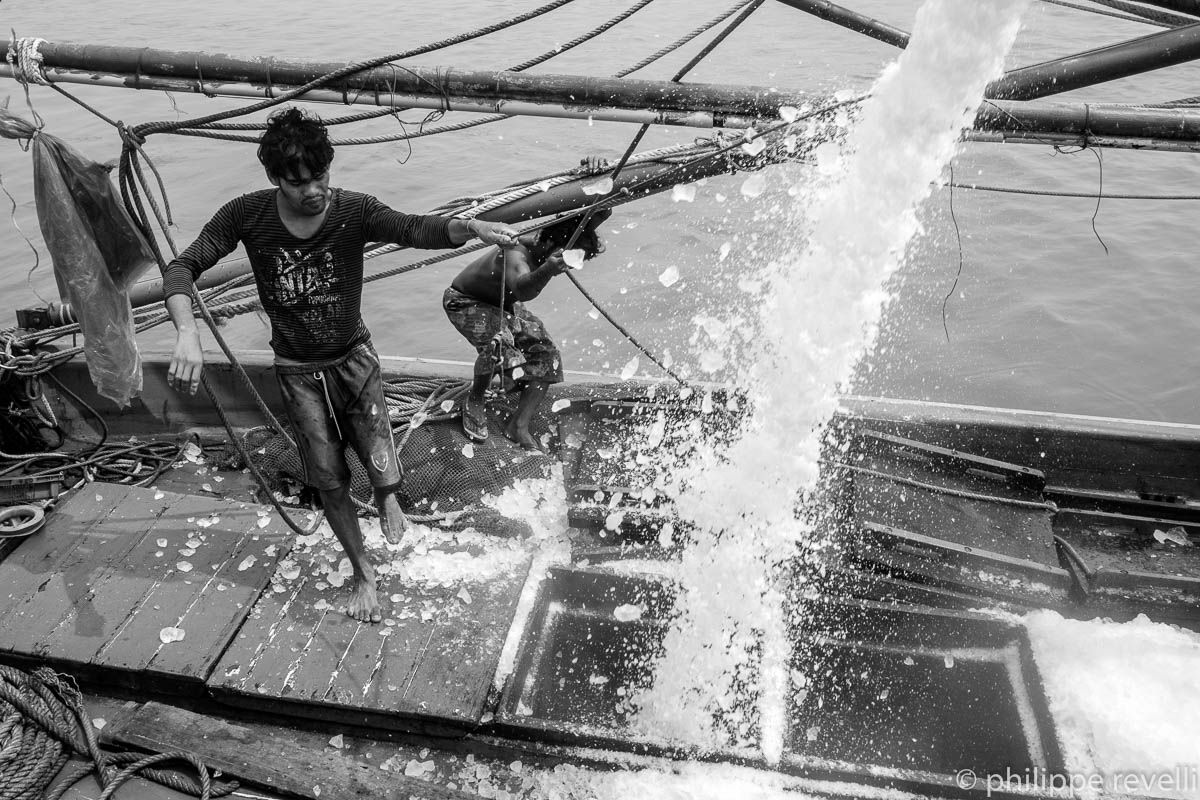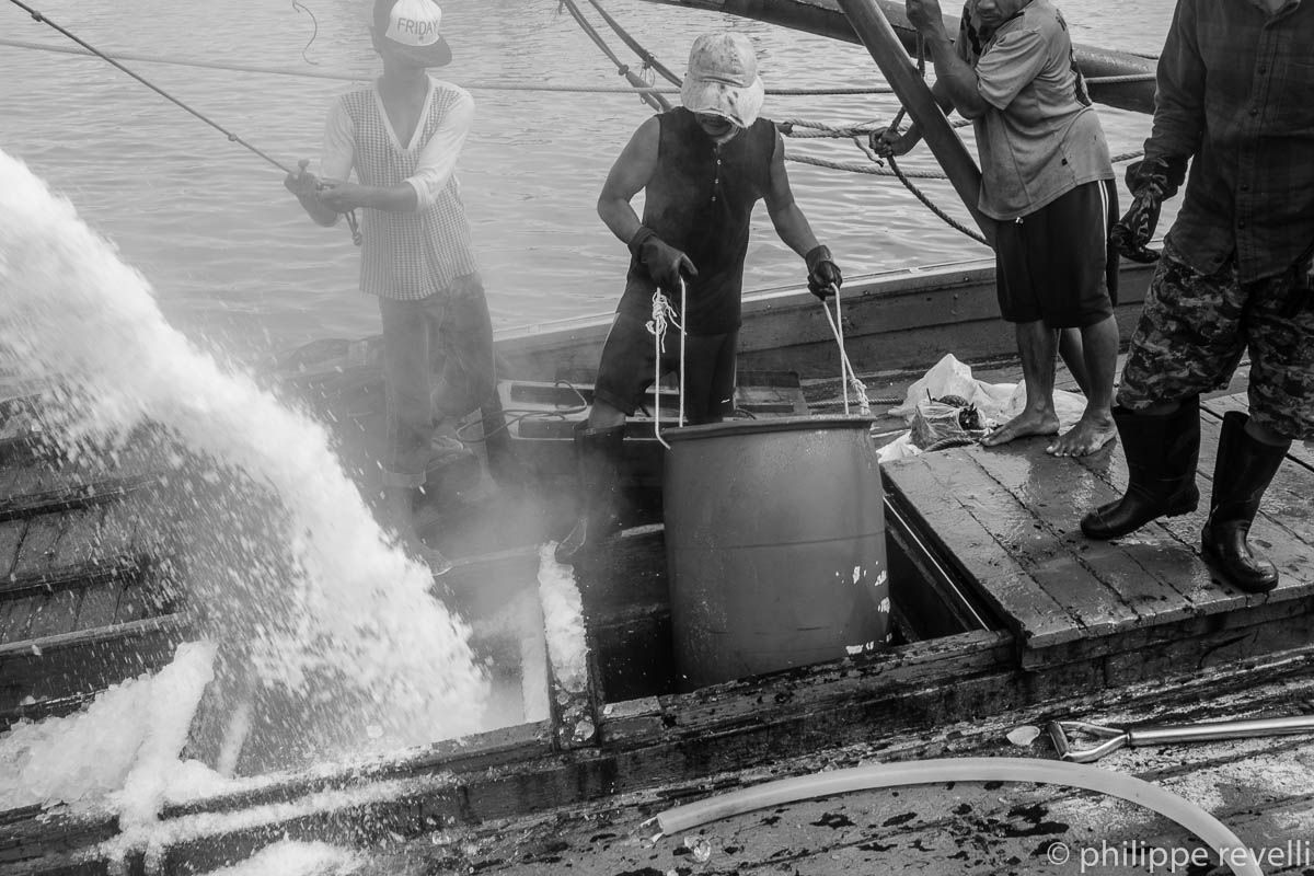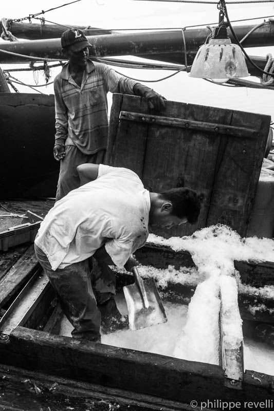 Songkhla / Port de pêche. De la glace pilée est chargée dans la cale d'un bateau de pêche en prévision d'un prochain départ.