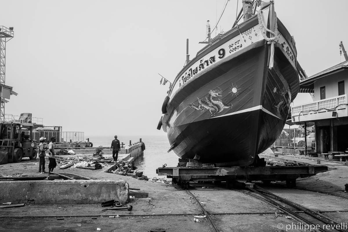 Songkhla / Chantier naval UNITHAI. Carénage d'un bateau de pêche.