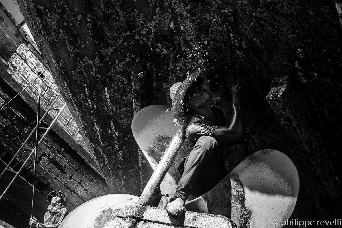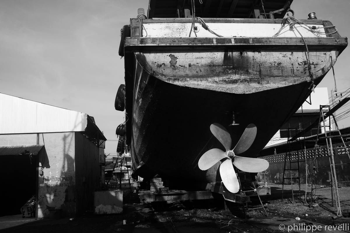 Songkhla / Chantier naval UNITHAI. La coque est grattée pour la débarrasser des algues et bernacles qui l'ont colonisé.