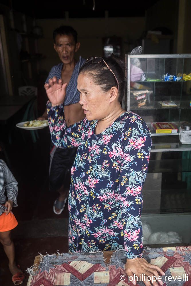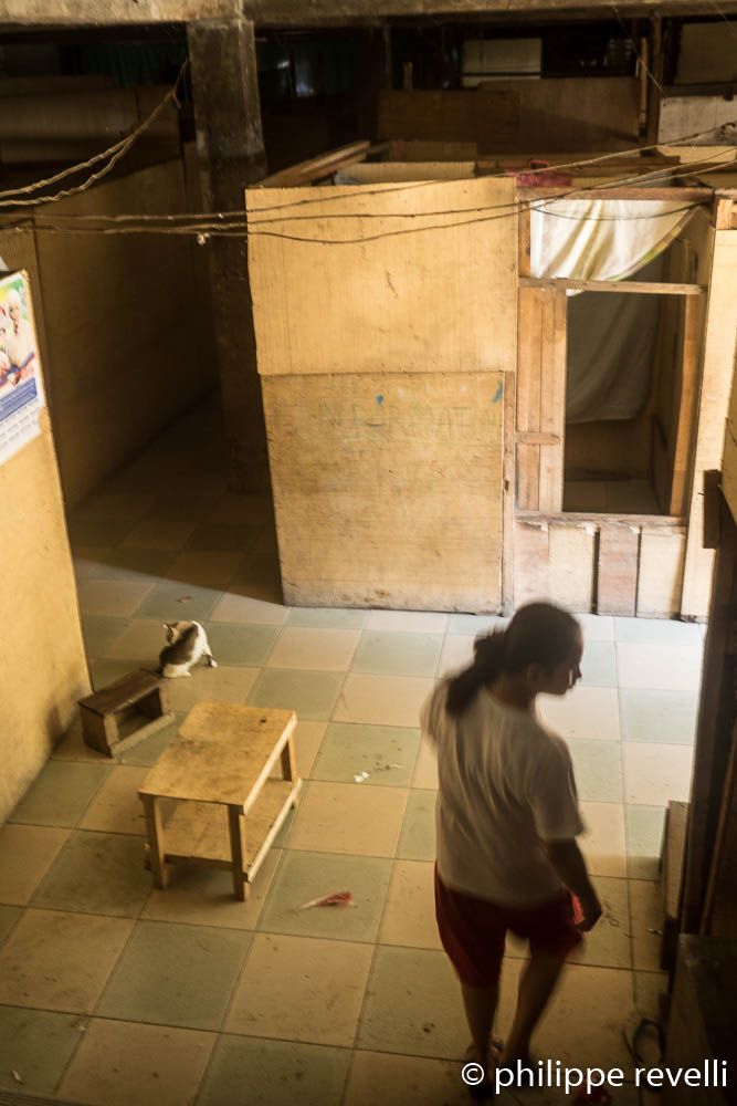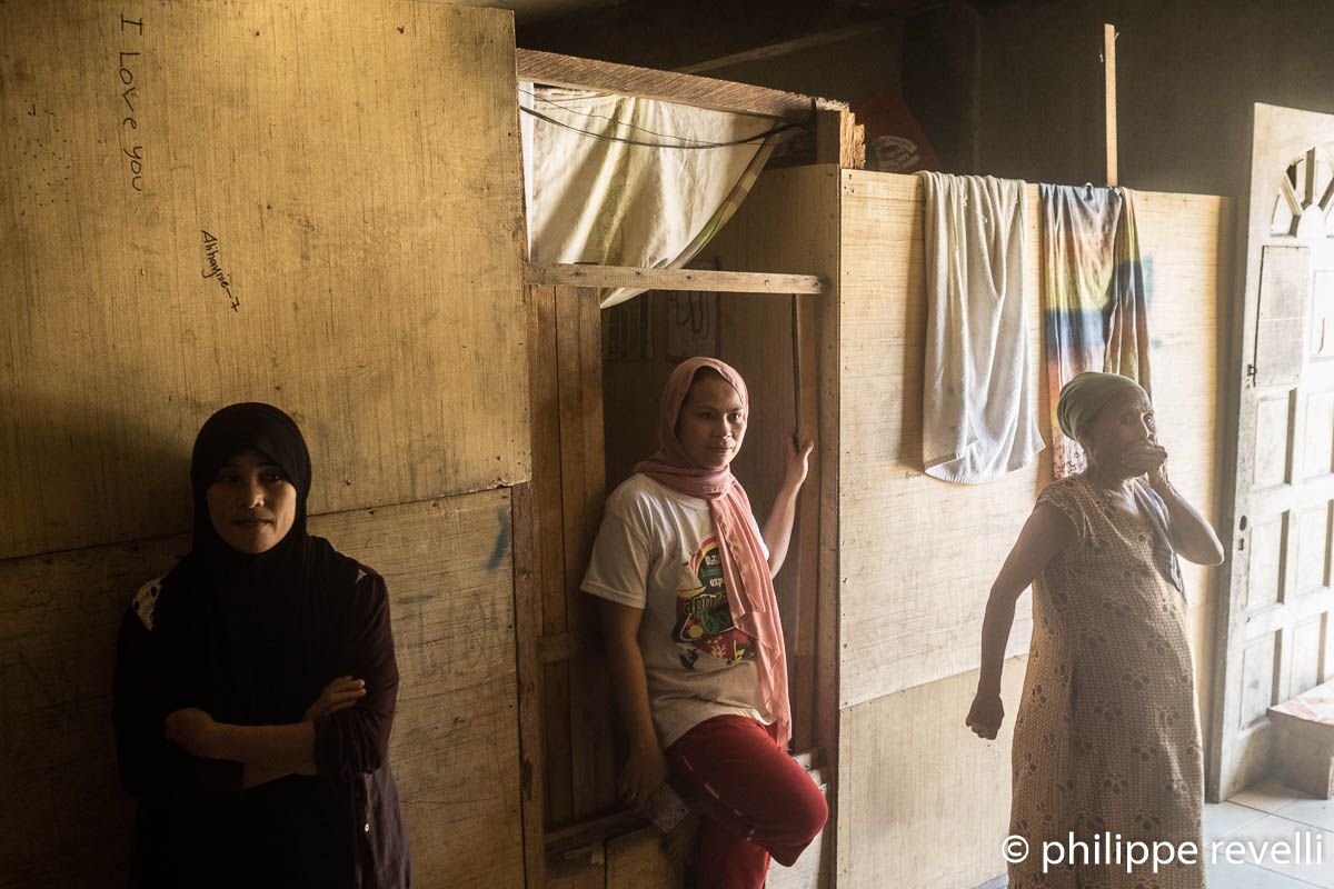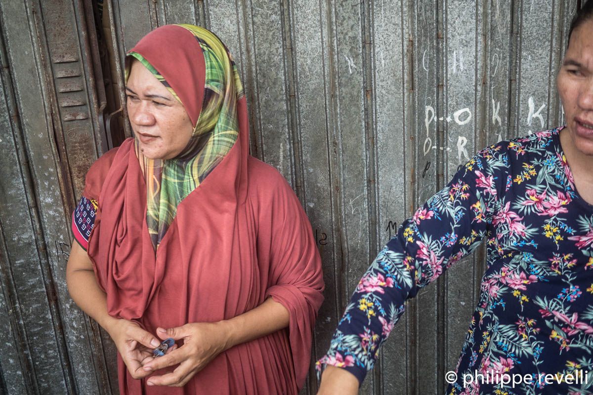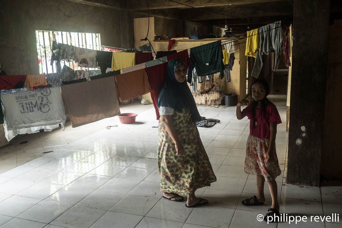 Lawangkera Minaga, se présente comme la présidente du campement de Toril. Ouvert une semaine après le début de la bataille de Marawi (avec le soutien du Mindanao People Peace Movement), celui-ci est installé dans une ancienne école coranique. C’est un bâtiment rectangulaire en ciment gris de trois étages. Ses longues salles ont été subdivisées en boxes par des cloisons de contre-plaqué. Chaque box devenant un « logement ». Durant les premiers mois, quelques 300 familles s’y entassaient. Elles sont aujourd’hui une trentaine, les autres ayant été transférées vers des centres d’hébergement provisoire situés aux environs de Marawi. Entre la présidente et ses vassaux, il semble que les relations ne soient pas au beau fixe : on lui reproche de se prévaloir de ses liens familiaux avec le propriétaire du bâtiment pour mener son monde à la baguette (décider, par exemple, des heures de coupures de l’eau et de l’électricité).