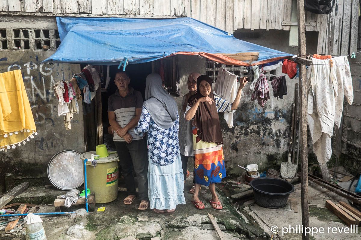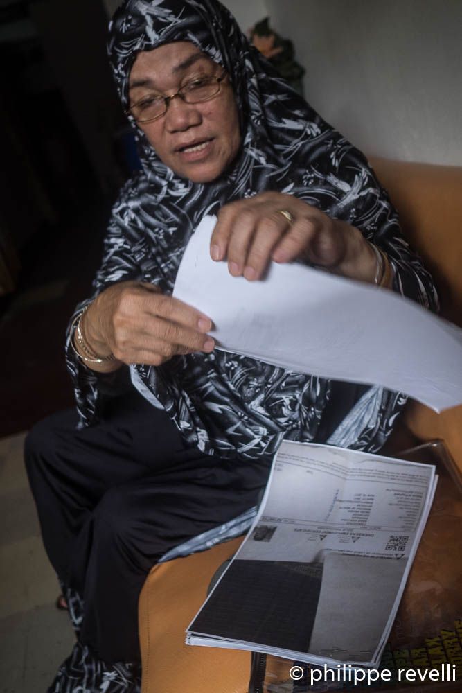 Aida Hadj Malik a 66 ans. Elle et son époux n’ont pu fuir Marawi que vers la mi-juin. Pendant plus de deux semaines, ils sont restés terrés dans leur maison prise entre deux feux. Quand ils sont arrivés à Iligan, ils ont trouvé refuge dans une série de baraques de planche et de tôle érigées dans l’urgence au bord d’un terrain de basket dans le barangay (quartier) d’Upper Hinaplanon. Aida, qui était catholique, s’est convertie à l’islam quand elle s’est marié – lui est un Lumad (indigène) de confession musulmane. A Marawi, Aida tenait un sari-sari (petite épicerie) au grand marché situé dans la zone aujourd’hui connue comme « Ground Zero » – toujours interdite au public. A Iligan, elle a reçu une machine à coudre dans le cadre d’un programme d’assistance aux réfugiés, mais les quelques travaux qu’elle réalise sont loin de lui assurer un revenu suffisant. Son mari, lui, est employé quelques heures par-ci par-là comme balayeur municipal. Tous deux ne rêvent que de rentrer chez eux – « s’établir à Iligan ? Non, non, dit Aida, les gens d’ici ne nous aiment pas… » – mais leur maison a été détruite et les procédures d’attributions d’un nouveau logement sont interminables et, affirme Aida (elle n’est pas la seule) : « y’a rien à espérer sans relations dans la Task Force Bangon Marawi (l’organisme chargé de coordonner la reconstruction) ou le soutien de gros bonnets ».